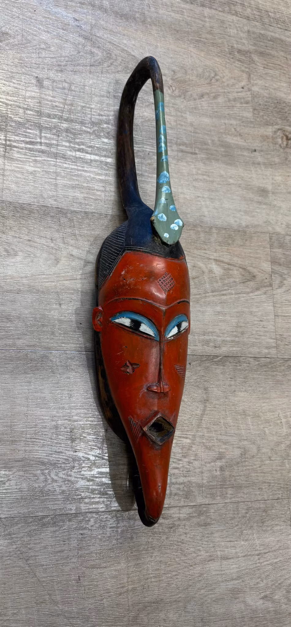 Maske 1800-tallet fra Elfenbenskysten 4 600,- Høyde 62,5 cm. Bredde 14 cm.Håndlaget med orginal maling. På lager Legg i handlekurv Lagerbalanse: 1 Artikkelnummer: 1190 Del Informasjon Høyde 62,5 cm. Bredde 14 cm.Håndlaget med orginal maling.