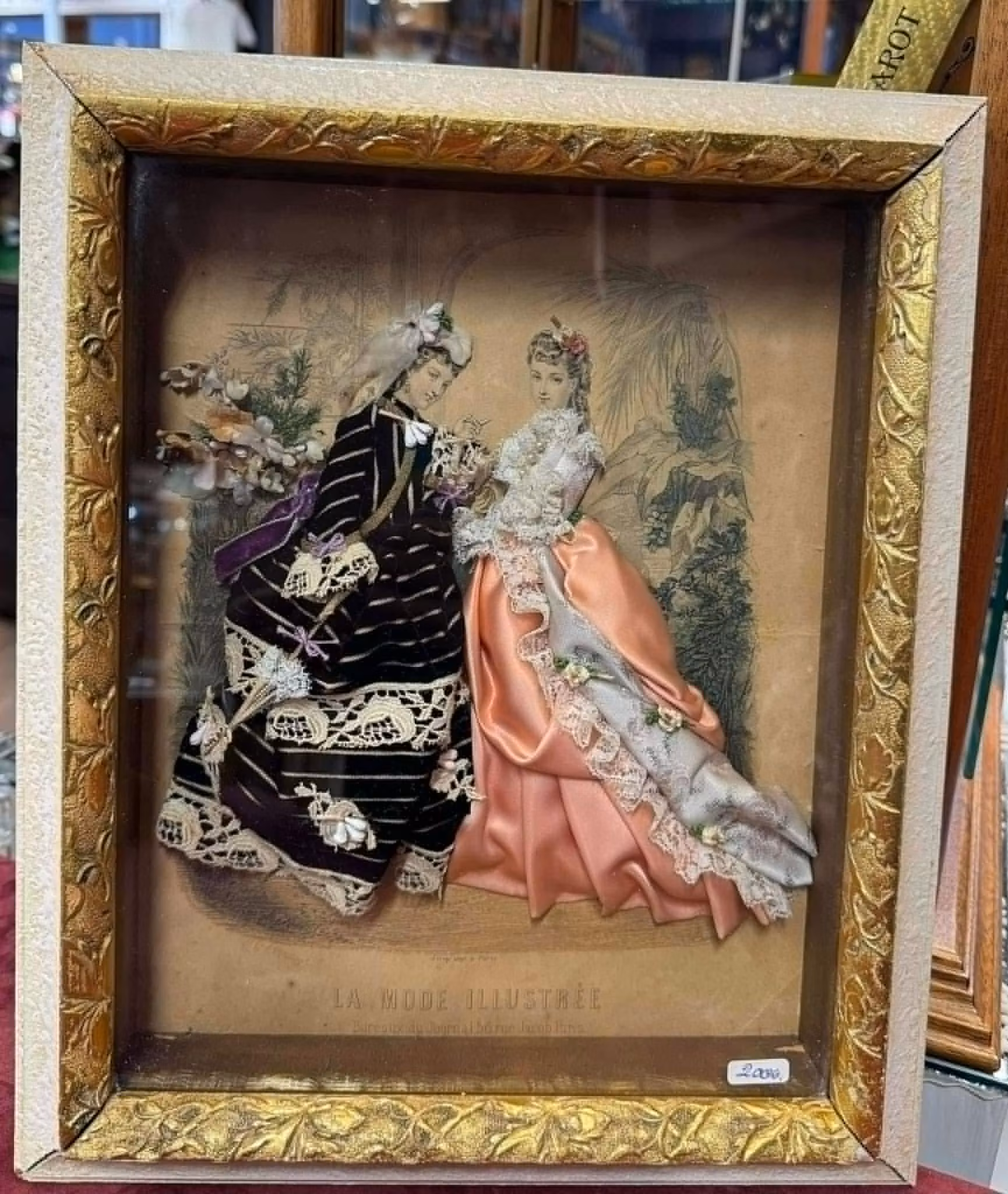 Antikke FRanske bilder , er i en kasse , er produsert kjolene i stoff , veldig fint arbeide , bør sees , kommer ikke frem ortnlig på bildene, 3 d , bilder