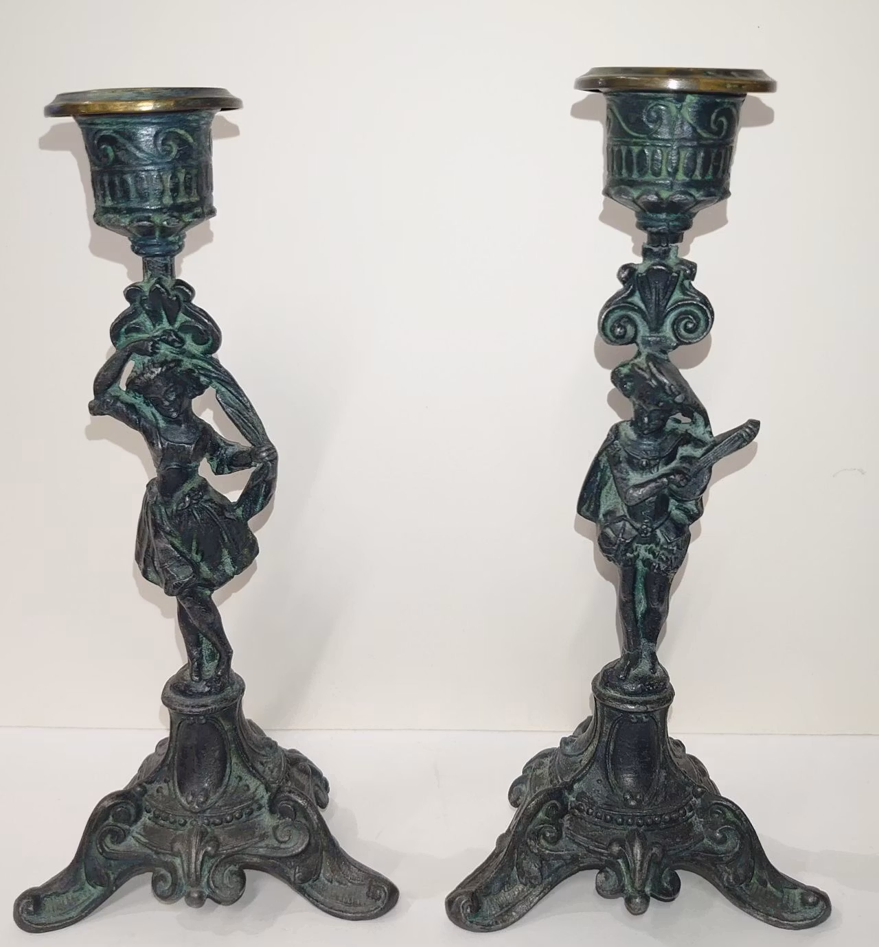 Et par lysestaker. Ser ut som bronse .Dame og mann. Stemplet under i bunnen. Høyde 22 cm. Bredde på det bredeste 11 cm. Vekt 738 g. for begge.