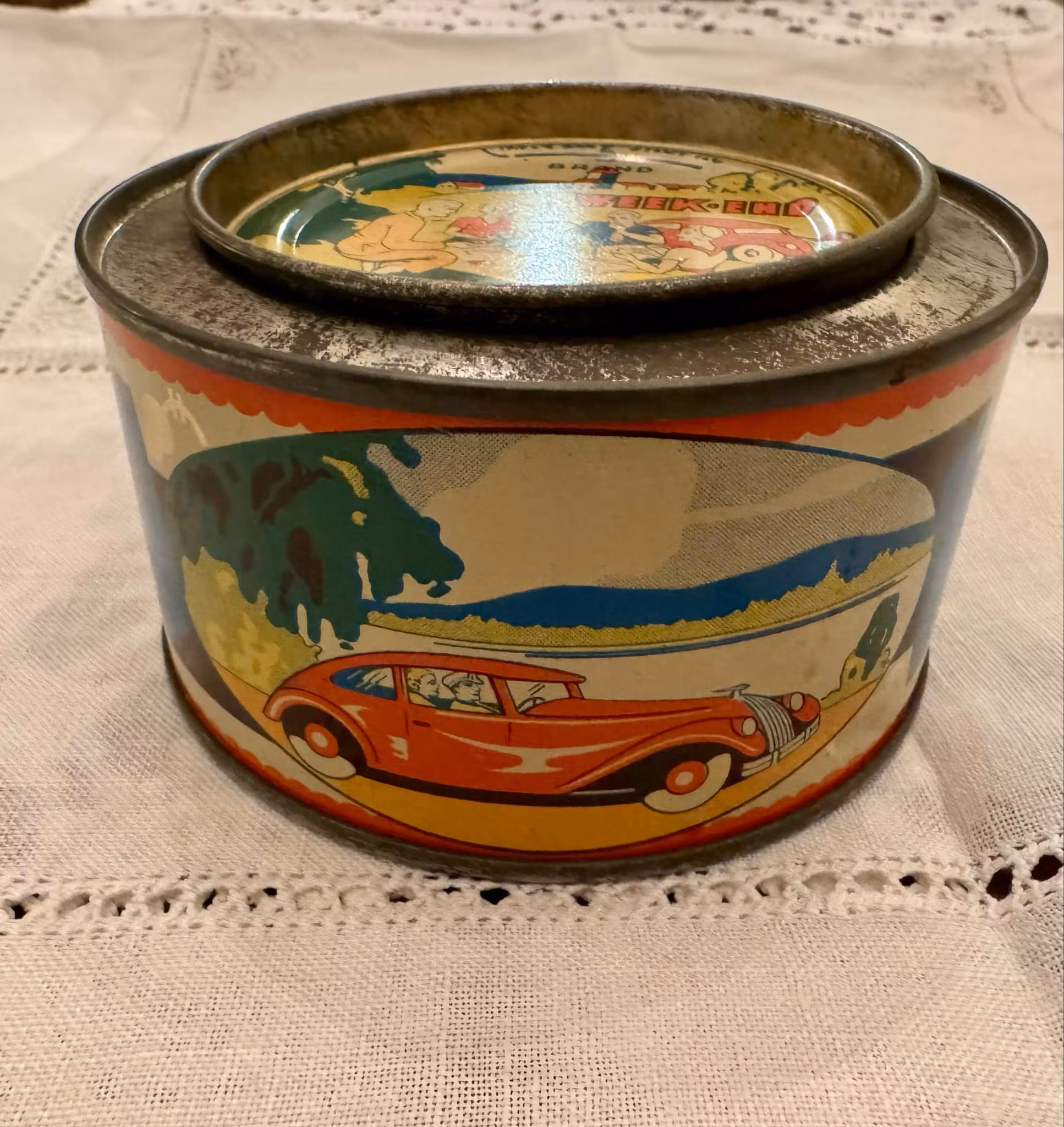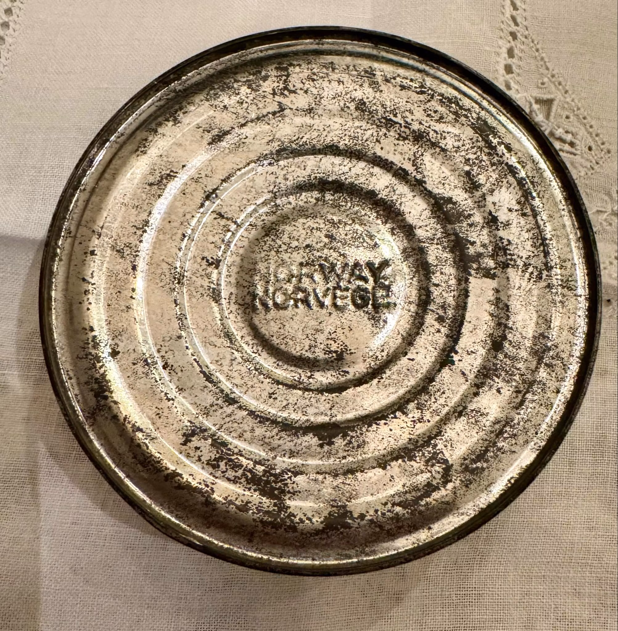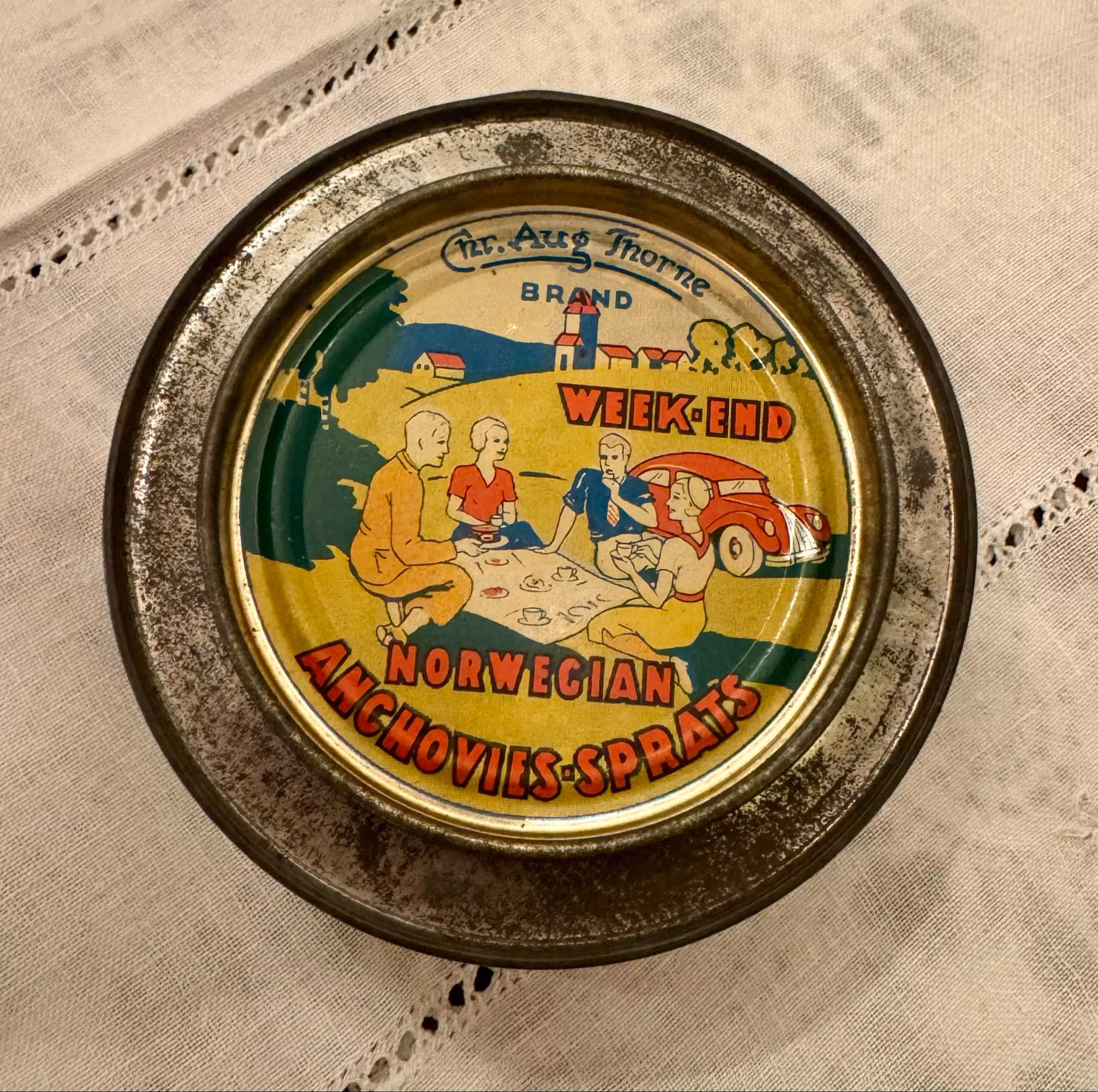 Gammel ansjos boks fra ,, Chr Aug Thorne Moss . Dia 11 cm , H - 7 cm , Alle bildene på boksen er 100% , der det er blankt metal er det noen svarte prikker , tror det er å pusse vekk , boksen er fra 30 tallet og har aldri hatt sild i seg , Ubrukt, Tror ikke mange har denne boksen i , kr 750,-