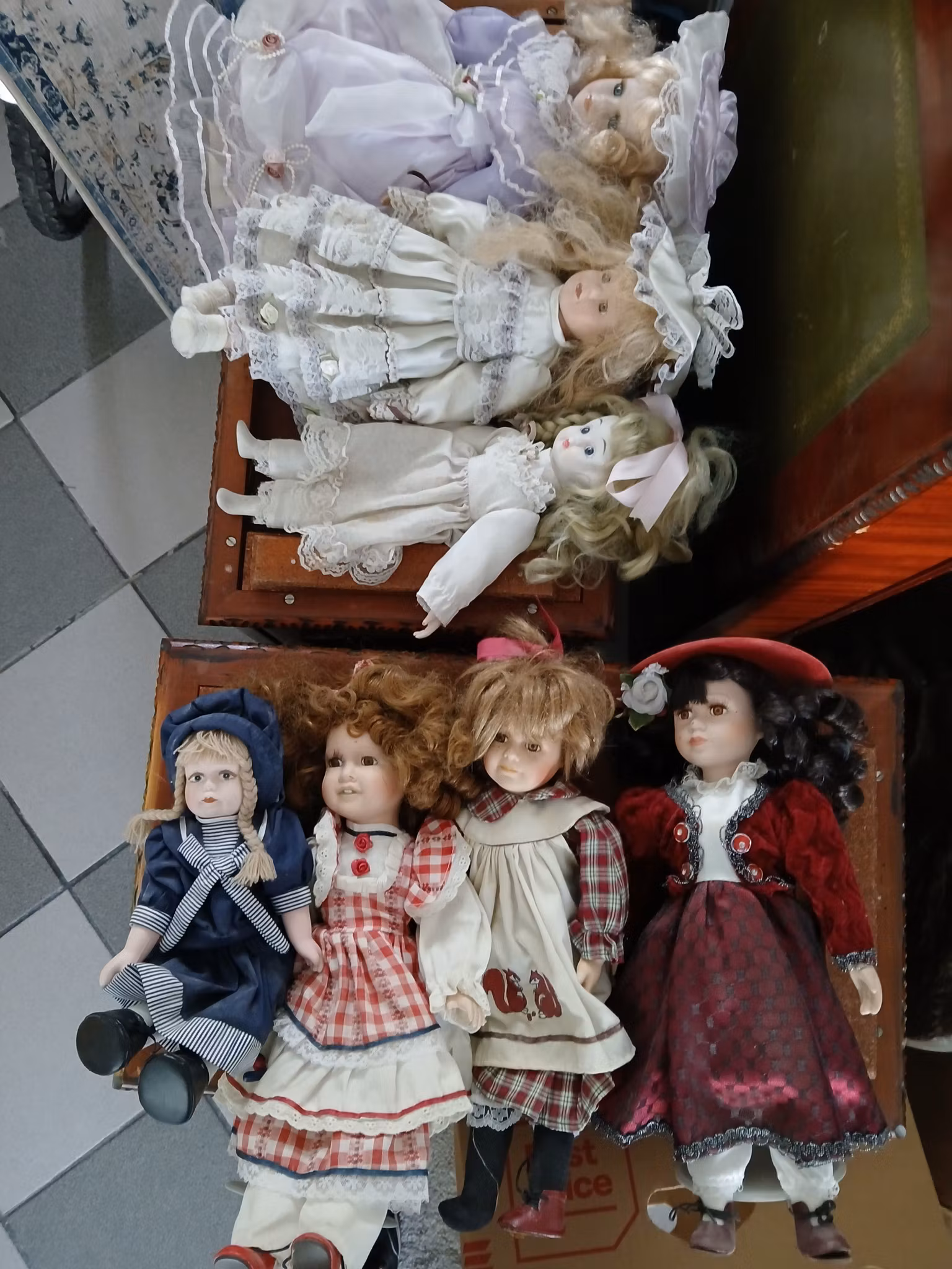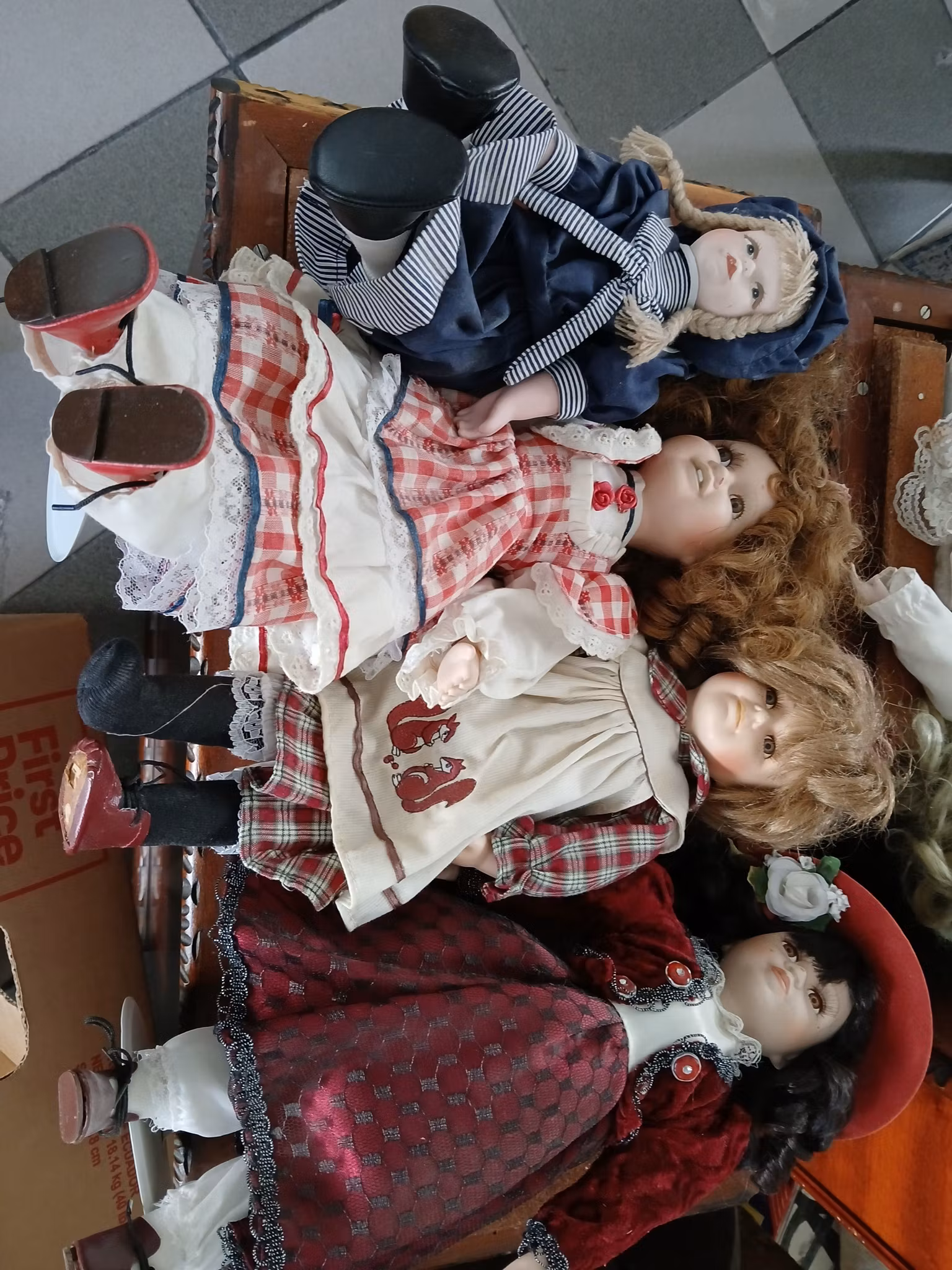 Samling av porselensdukker i ulike størrelser og farger. Dukker i forskjellige antrekk, inkludert blonder og detaljerte kjoler. Ideell for samlere eller som dekorasjon. 7 Porselens dukker ,35-40 cm lange, alle er hele og pene , en mankerer en sko , selges kr 300,-
