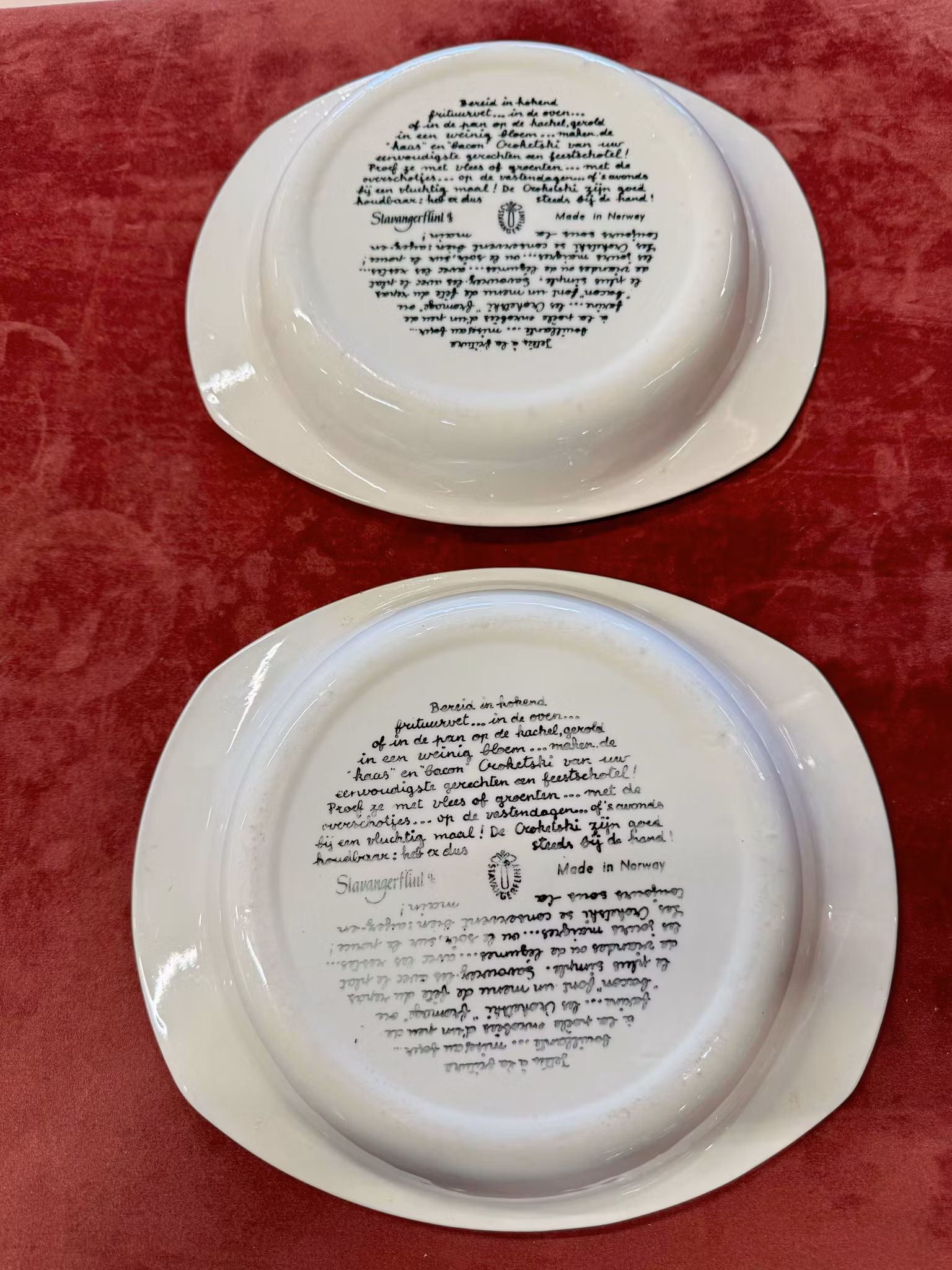 Stavangerflint Ildfast fat 2 stk. 500,- 2 stk. fat selges samlet.Noe bruksspor.Mål 25,5x21,5 cm. Høyde 3 cm. På lager Legg i handlekurv Lagerbalanse: 1 Artikkelnummer: 206 Del Informasjon 2 stk. fat selges samlet.Noe bruksspor.Mål 25,5x21,5 cm. Høyde 3 cm.