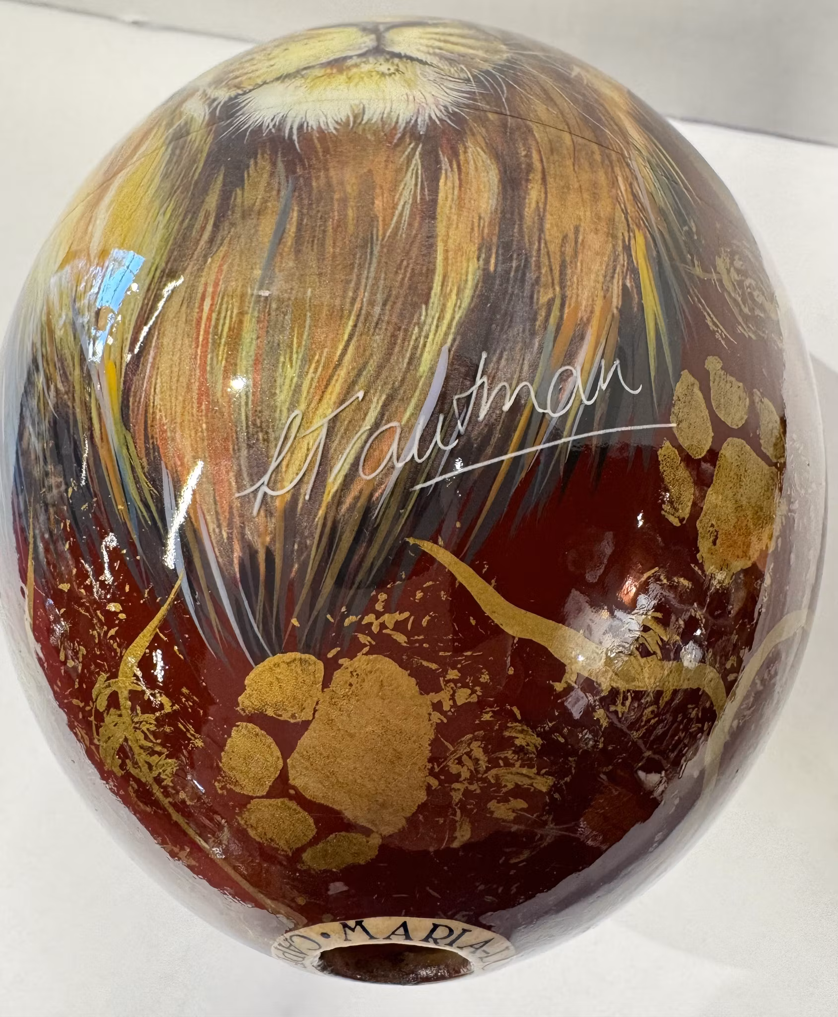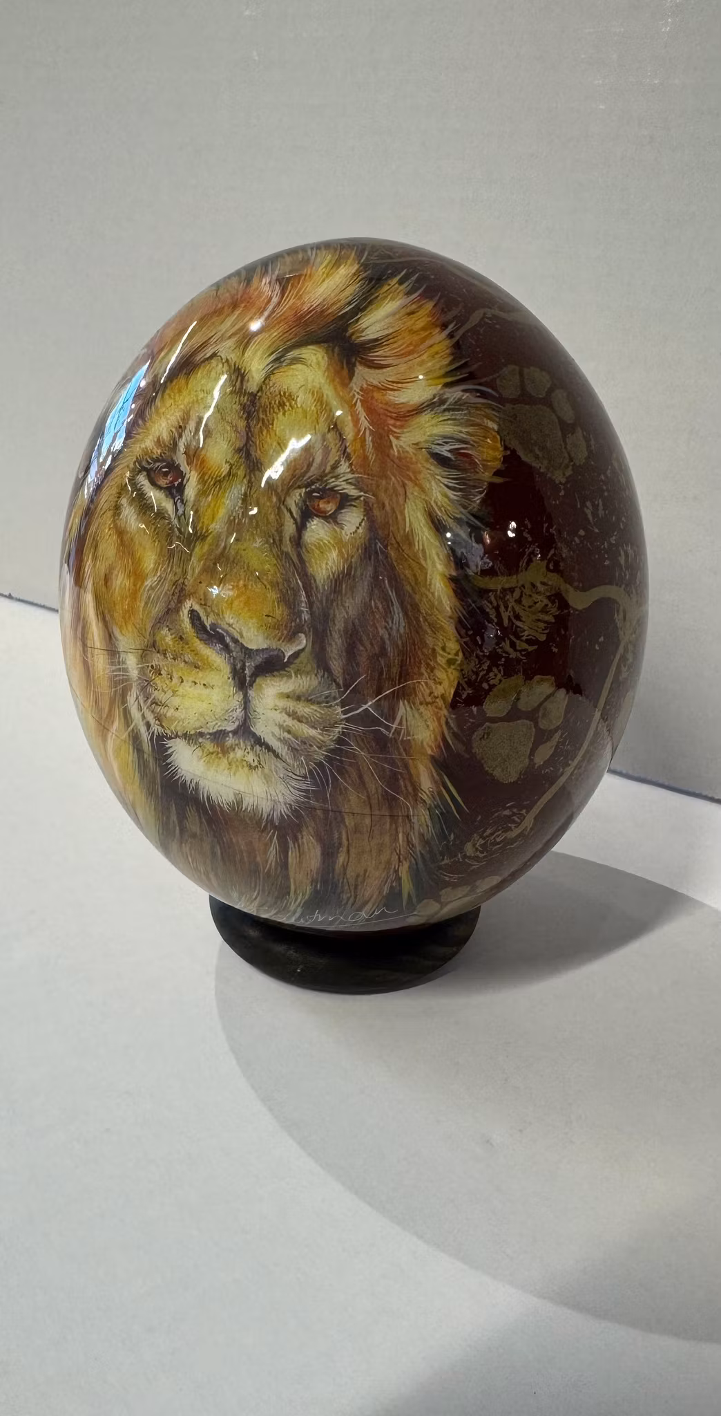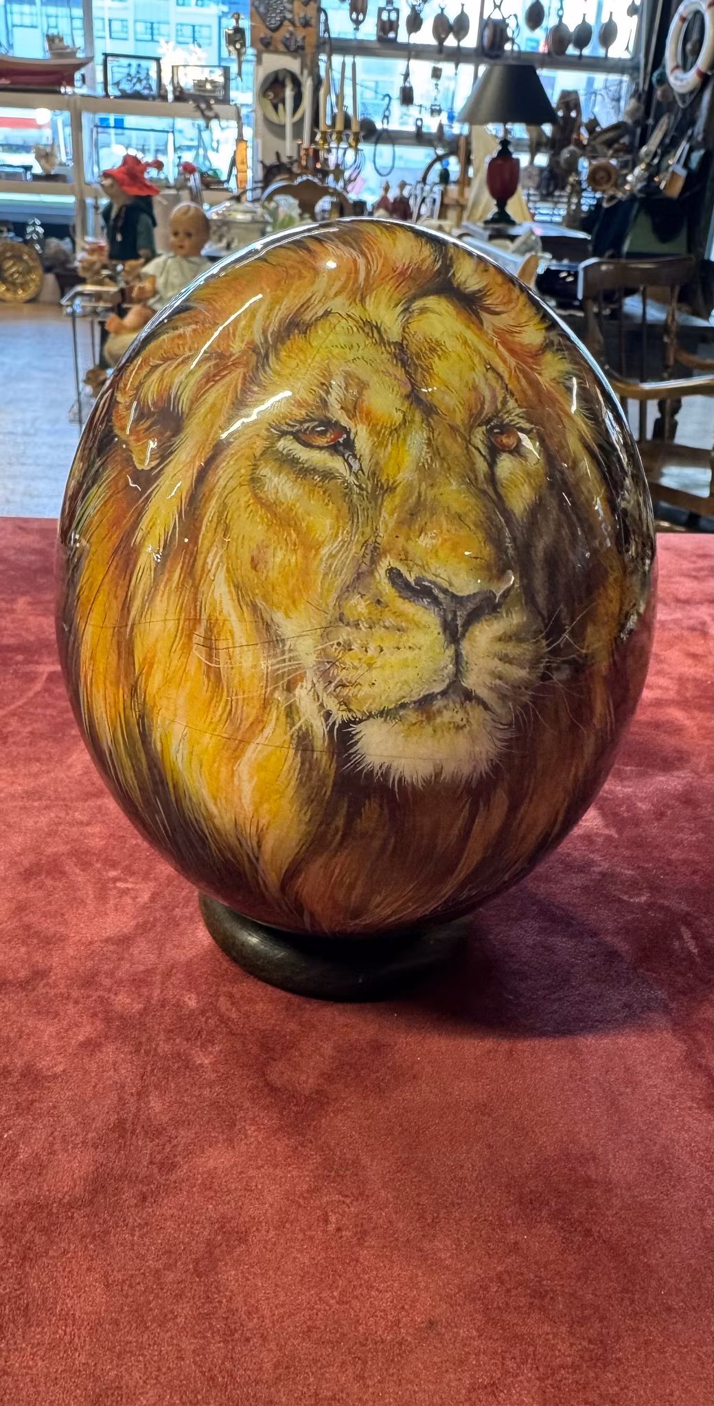 Strutse egg med motiv av Løve 2 100,- Høyde ca. 16,5 cm. Bredde ca. 12,5 cm.Signert. På lager Legg i handlekurv Lagerbalanse: 1 Artikkelnummer: 431 Del Informasjon Høyde ca. 16,5 cm. Bredde ca. 12,5 cm.Signert.